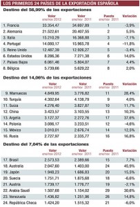 El país puntero en cuanto a exportaciones se refiere es nuestro país vecino, Francia, seguido de Alemania, Italia, Reino Unido, Portugal, Estados Unidos, Países Bajos y Bélgica, quienes concentran más de la mitad de las exportaciones realizadas.